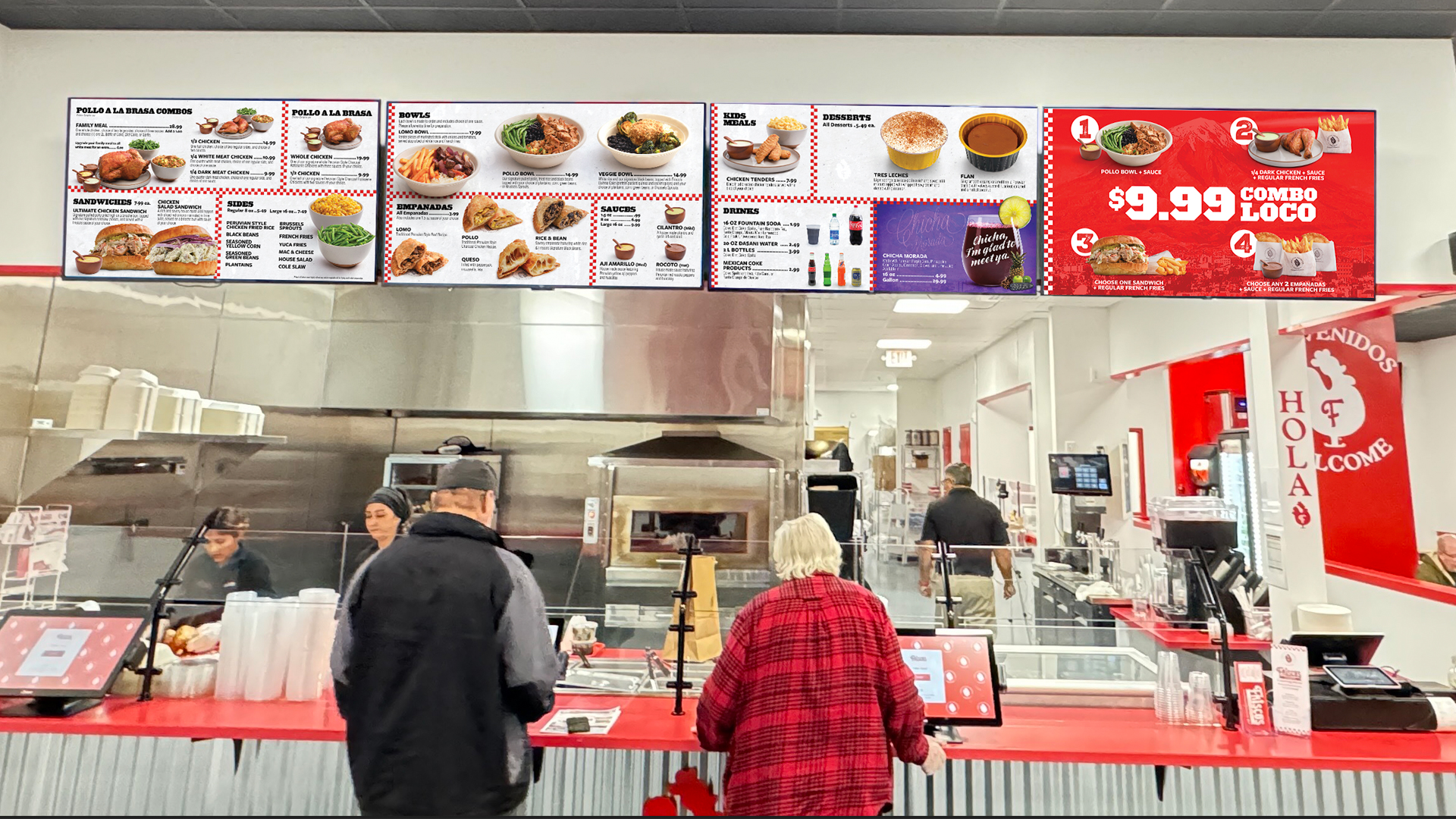 Frisco’s menu system seamlessly bridges authentic Peruvian cuisine with contemporary ordering ease. The physical menus invite exploration with vibrant photography of signature dishes like Pollo a la Brasa and empanadas, while clear section organization guides customers through their culinary journey. Overhead digital menu boards bring the same visual appeal to quick-service ordering, featuring high-margin items prominently and allowing for dynamic promotion of seasonal offerings and the popular $9.99 Combo Loco. Both formats maintain consistent brand elements—the distinctive red checkered pattern, Andean mountain imagery, and careful attention to highlighting the three signature Peruvian sauces. The digital displays extend functionality through promotional rotation capabilities, enabling Frisco’s to spotlight limited-time offers or newly introduced dishes without reprinting menus. Each design choice supports the dual goals of operational efficiency and authentic representation of Arequipa’s culinary heritage.