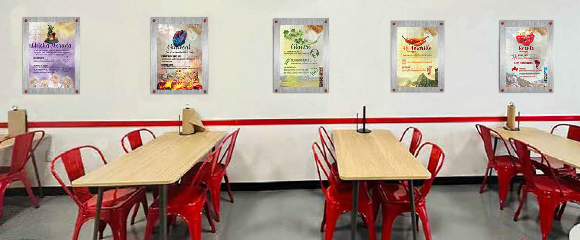 Frisco’s interior poster series transforms the dining experience into a cultural journey through Peruvian gastronomy. Each of the five educational displays features a key ingredient or cooking method that defines the restaurant’s authentic offerings. Using a textured, map-like background with color schemes tailored to each subject, the posters become windows into Peruvian culinary heritage. Customers learn about the distinctive heat levels of Rocoto (100,000 Scoville units) and Aji Amarillo peppers, the polarizing genetic response to cilantro, and the ancient traditions behind Chicha Morada’s purple corn beverage. The charcoal cooking poster reveals how this ancient fuel imparts distinctive smoky aromas that define Peruvian pollo a la brasa. Adorned with cultural iconography, geographical references to the Andes, and illustrations of traditional Peruvian dancers, these displays serve dual purposes – educating diners about unfamiliar ingredients while reinforcing the authenticity that sets Frisco’s apart from ordinary chicken restaurants. The posters create memorable talking points that extend the dining experience beyond just a meal into a genuine cultural exchange.